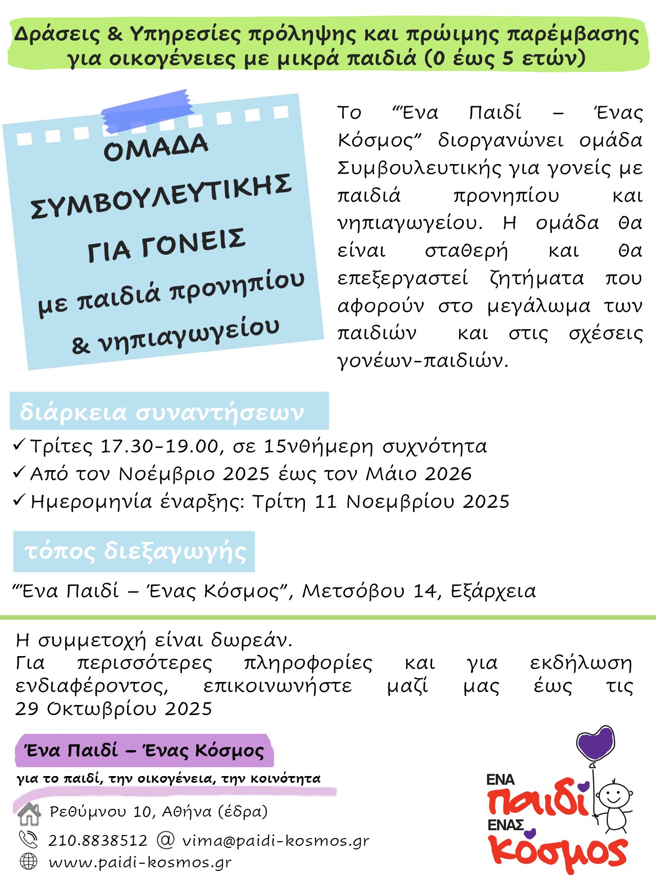 Ομάδα Συμβουλευτικής για γονείς με παιδιά προνηπίου & νηπιαγωγείου